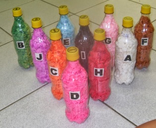 * O material usado para criar o boliche pode ser de acordo com algo que a família consome. Outra dica é a pescaria com letras.